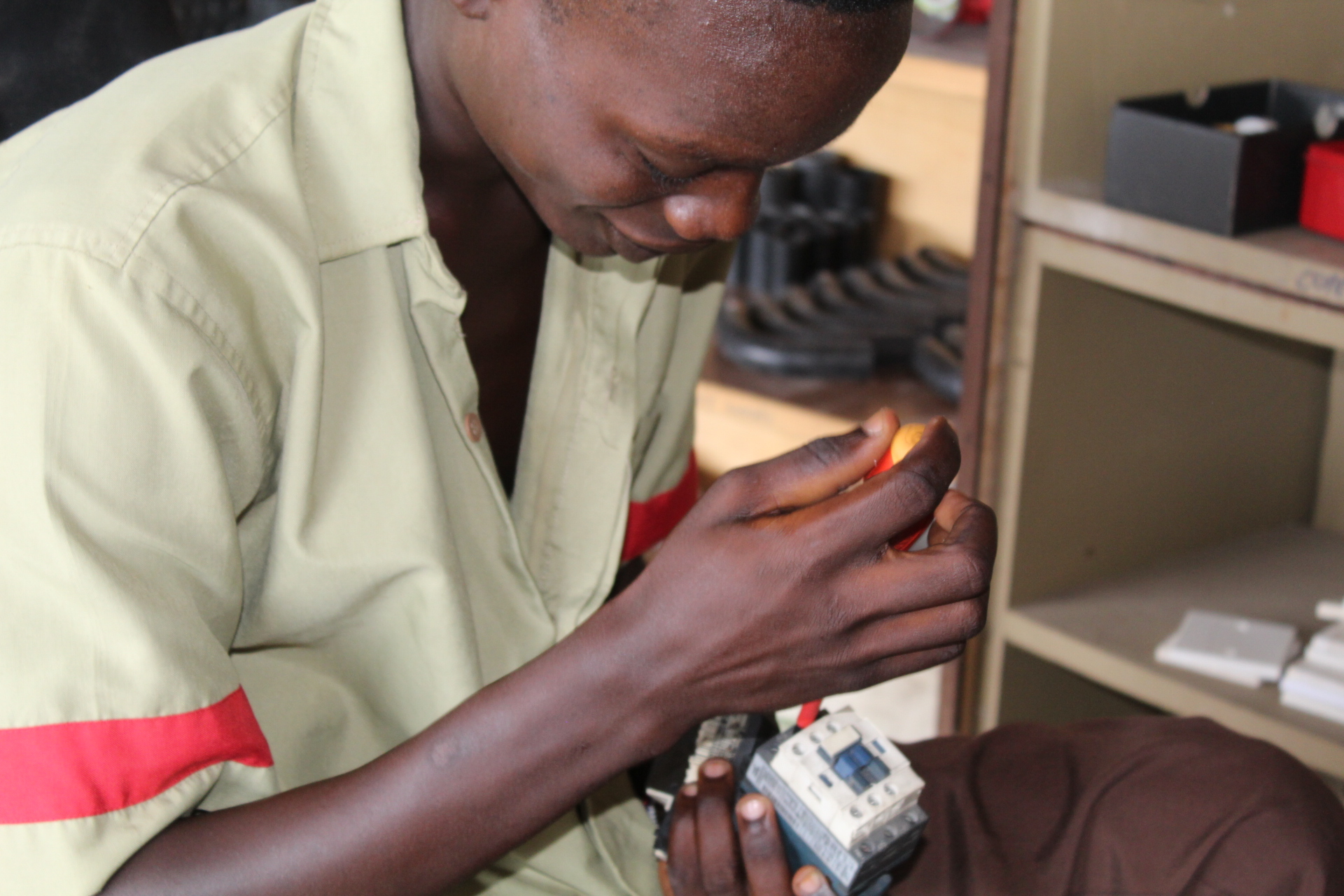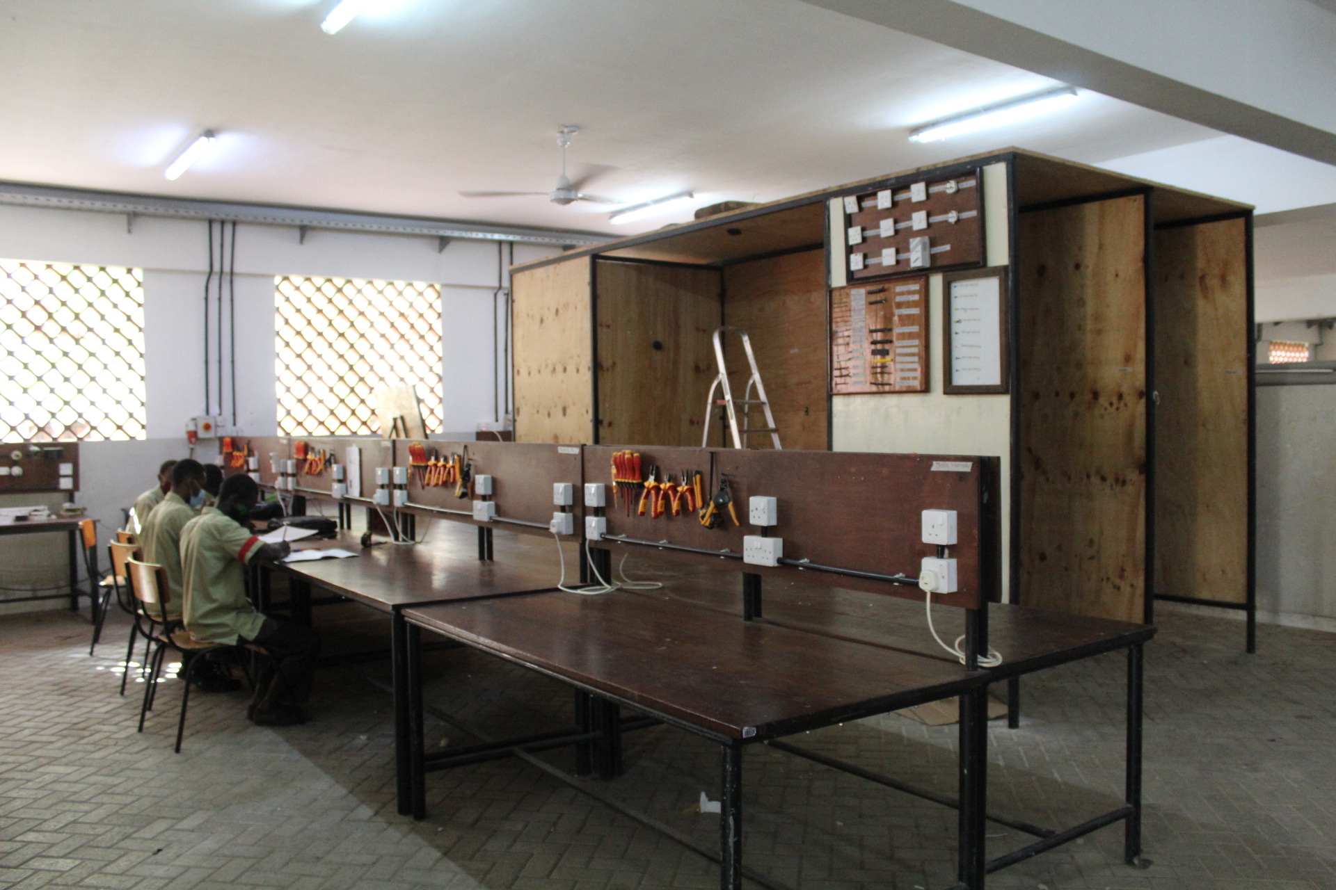 Der Elektrobereich ist mit den erforderlichen Handwerkzeugen und Geräten ausgestattet, um präzise elektrische Arbeiten durch den Auszubildenden durchführen zu können. In Zusammenarbeit mit den kompetenten Technikern der Abteilung werden die Auszubildenden an der Wartung aller elektrischen Installationen und an der Herstellung neuer Installationen beteiligt sein. Mit dem Hintergrund des Hotels Severin Sea Lodge und dem Vergnügungspark Mombasa Go-Kart gibt es immer wieder eine Fülle von elektrischen Projekten zu bearbeiten. Neben den üblichen Arbeiten an Beleuchtungsanlagen, Pumpen und Maschinen werden auch Arbeiten an moderner Technik wie der Photovoltaikanlage und der Umkehrosmoseanlage des Hotels durchgeführt.